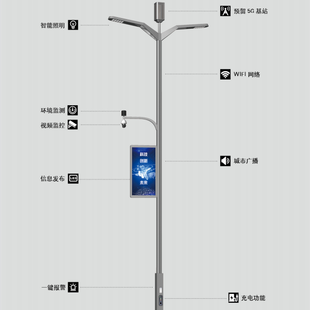 立杆成品含杆体、横臂、避雷针(可选)、底板法兰、检修口等,杆到工地即可安装使用。可加配地基笼及防水箱。横臂连接螺栓采用不锈钢螺栓。